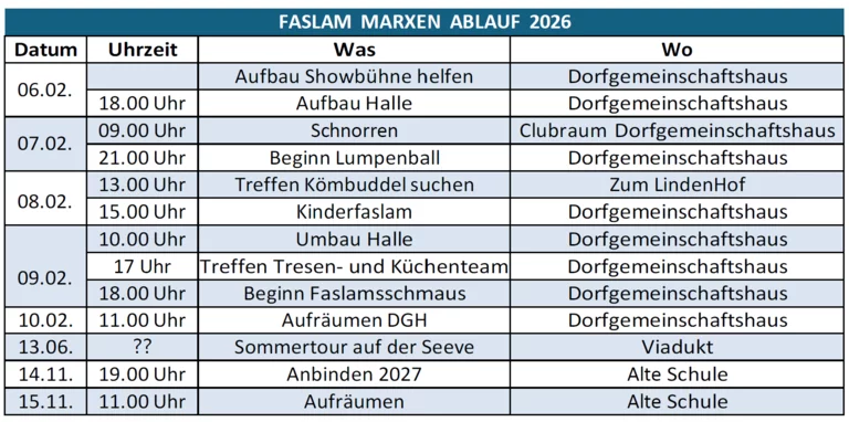 Hier bekommst du alle Infos rund um Faslam Marxen 2026. Ebenso erhältst du hier unsere PFÜ für den Lumpenball.